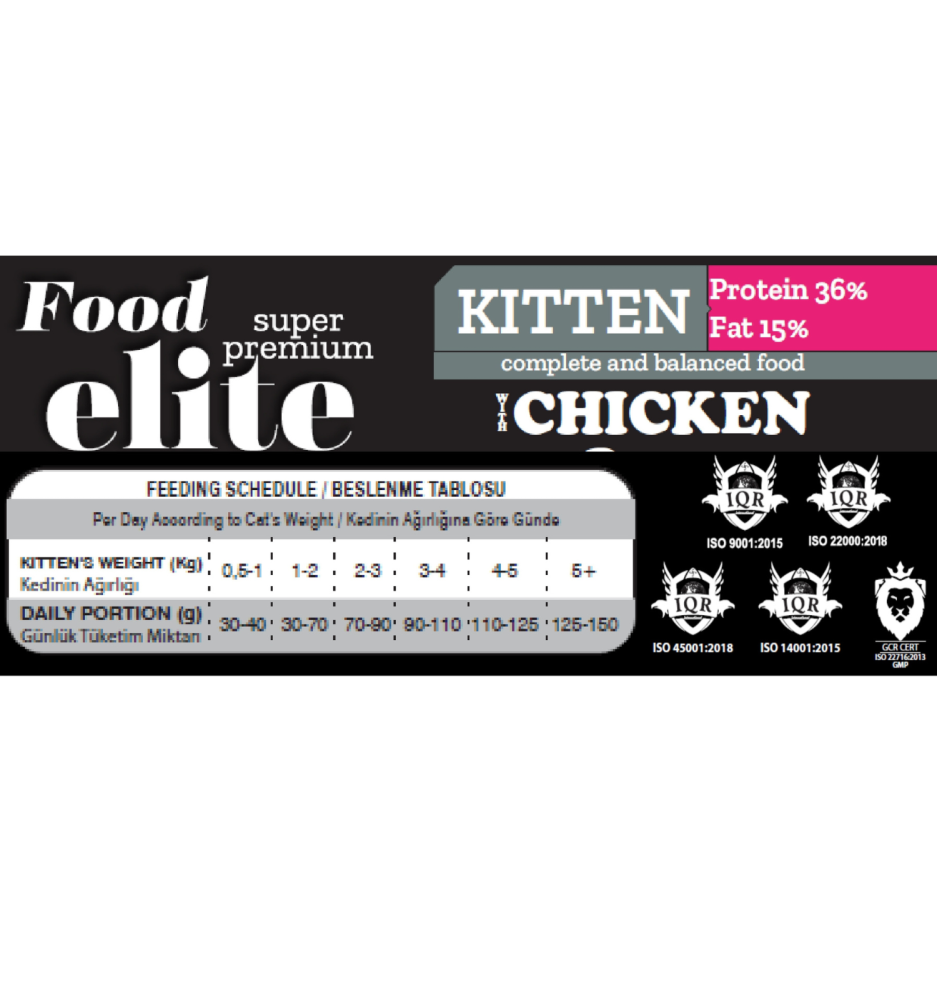 : بروتين 36%، دهون 15%، الرماد 8.15%، سليلوز 3.5%