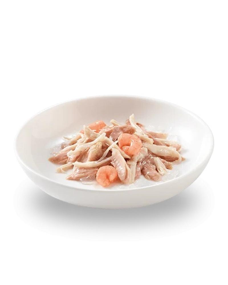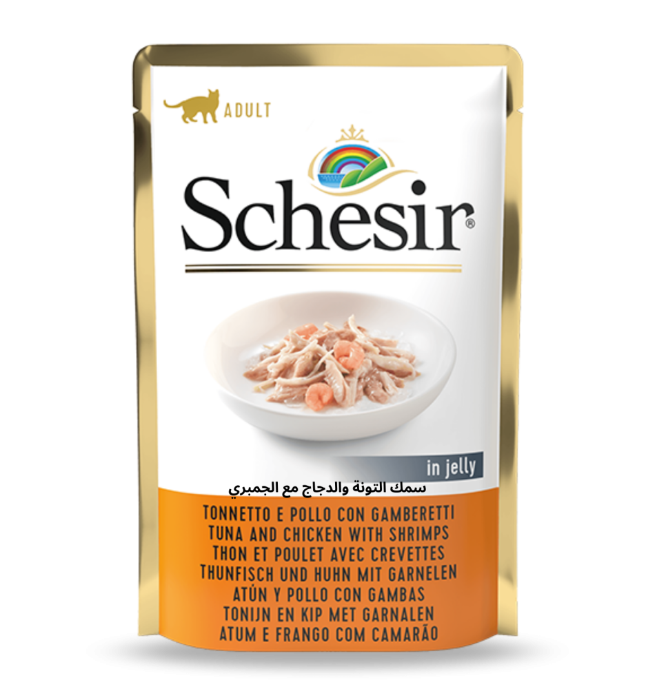 تعتمد وصفة Schesir هذه على سمك التونة الحقيقي وشرائح الدجاج المقترنة بطبقة من الروبيان اللذيذة ، وهي قشريات لذيذة توازن تناول البروتين بطريقة لذيذة وفعالة. الطبق في هلام لإرضاء القطط التي تفضل النكهة الطبيعية ، ولكن مع تناسق أكثر إحكاما في الوعاء.