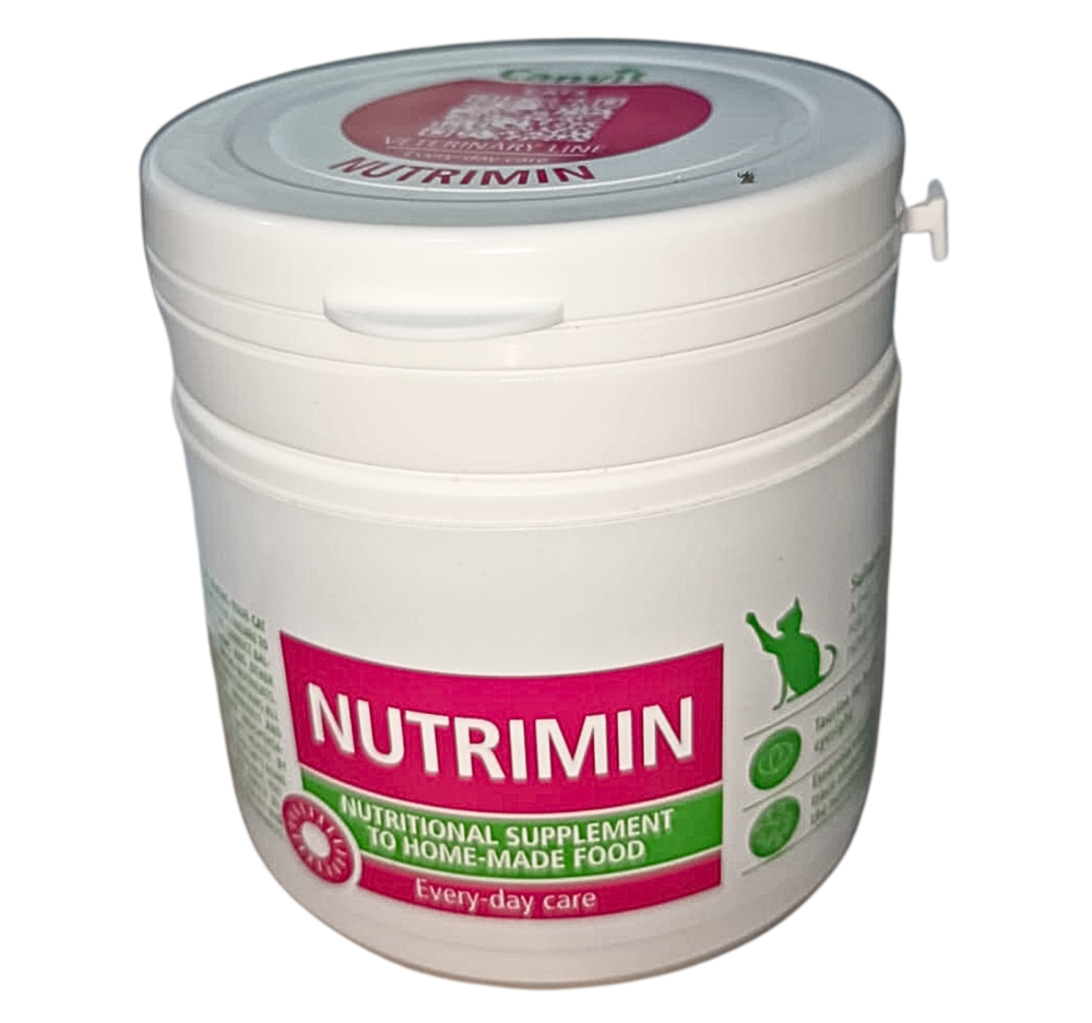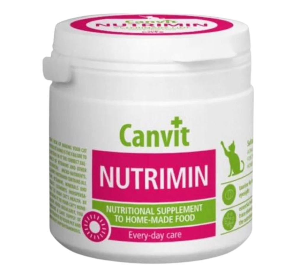 Canvit Nutrimin هو مكمل غذائي مصمم خصيصًا للقطط التي تتغذى على طعام منزلي. يحتوي على مزيج متوازن من 14 نوعًا من الفيتامينات والمعادن الأساسية، بالإضافة إلى التورين، لضمان تغذية متكاملة ولتجنب نقص الفيتامينات في النظام الغذائي.