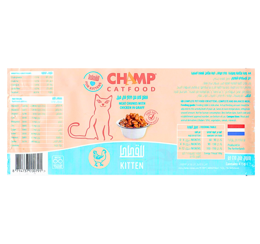 - التركيب: لحم ومشتقات حيوانية (4% دواجن)، خضروات، حبوب ومعادن.