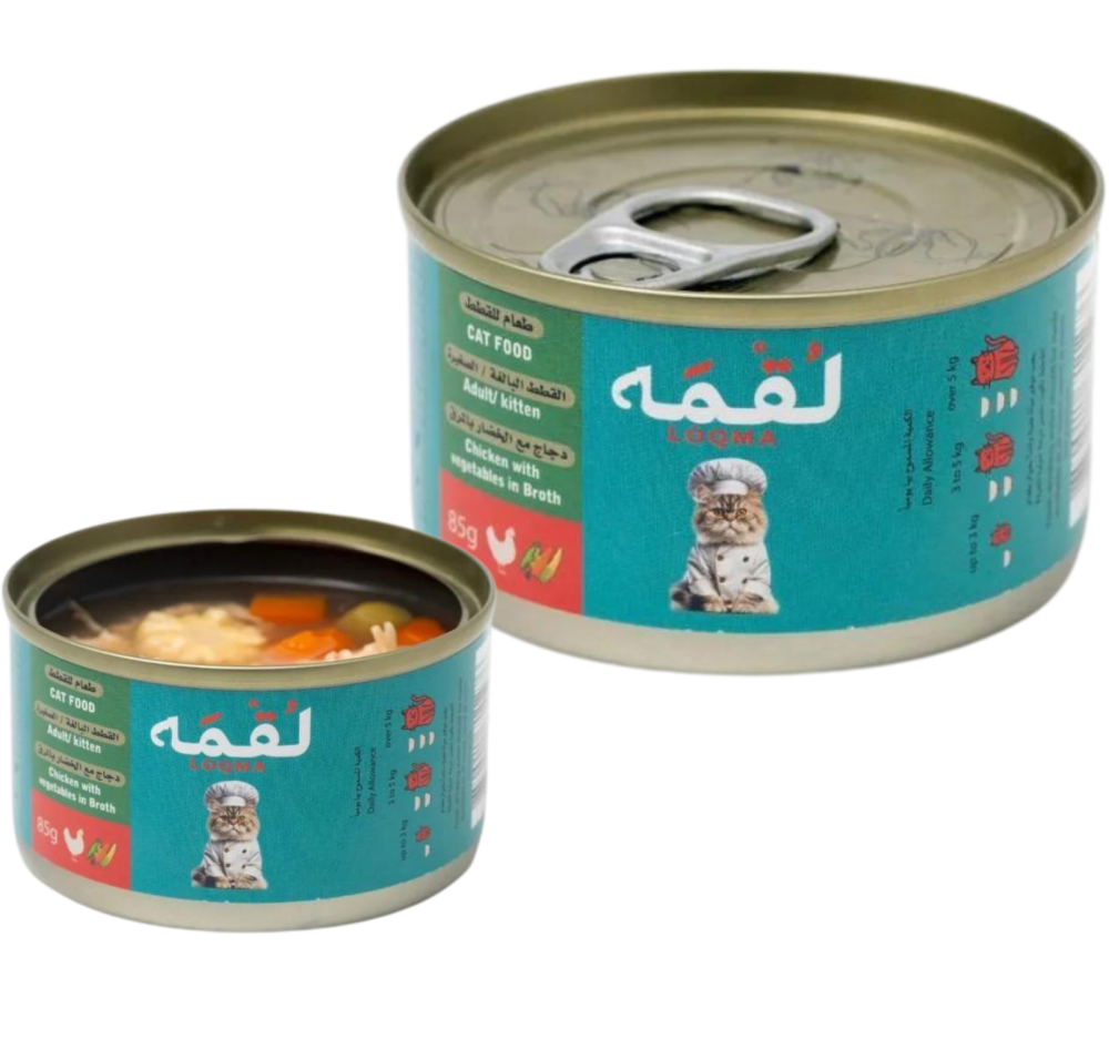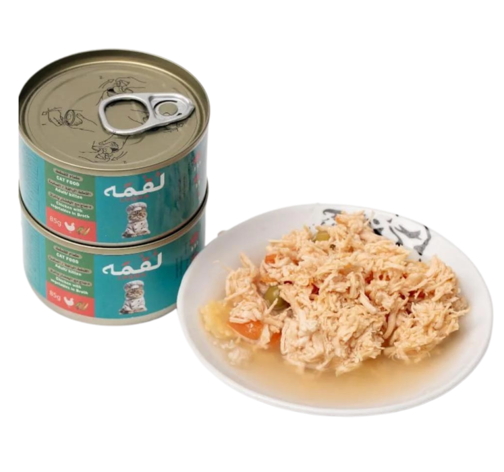 لقمه الدجاج مع الخضار بالمرق منتج طبيعي 100% طعام رطب للقطط البالغة والقطط الصغيرة اللحوم في المعلبات منتقاة من اجود انواع اللحوم , المكونات : دجاج 40% , هلام (ماء+ مسحوق جيلي مستخلص من مواد طبيعيه) 60% لا يحتوي على نشاء ولا حبوب او غلوتين.