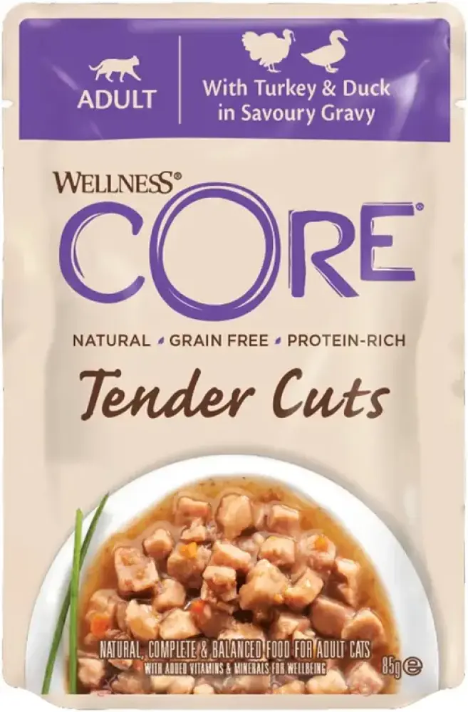 طعام قطط رطب فاخر من Wellness CORE Tender Cuts، مصنوع من قطع ديك رومي وبط طرية بالمرق، ليمنح قطتك وجبة شهية بطعم غني وقيمة غذائية متوازنة.